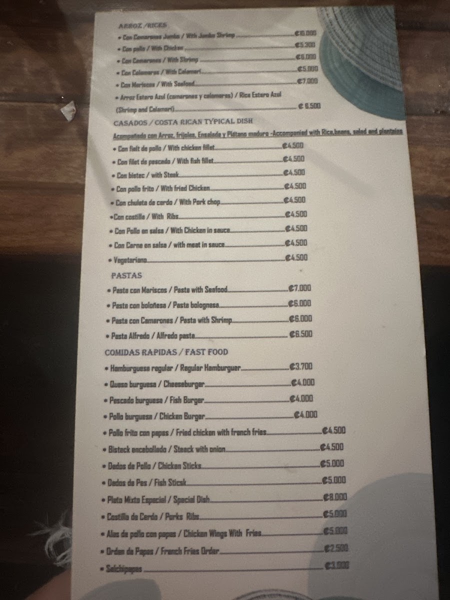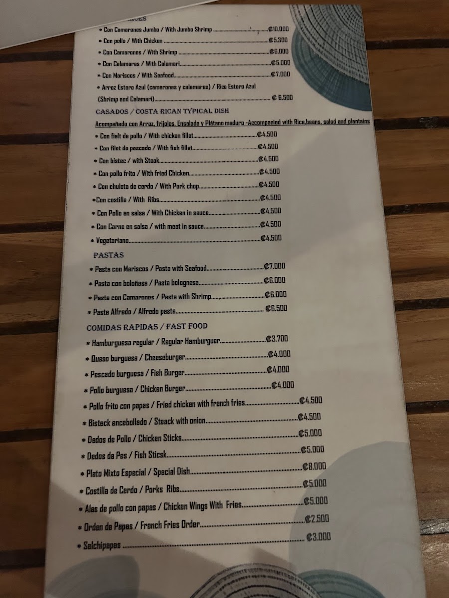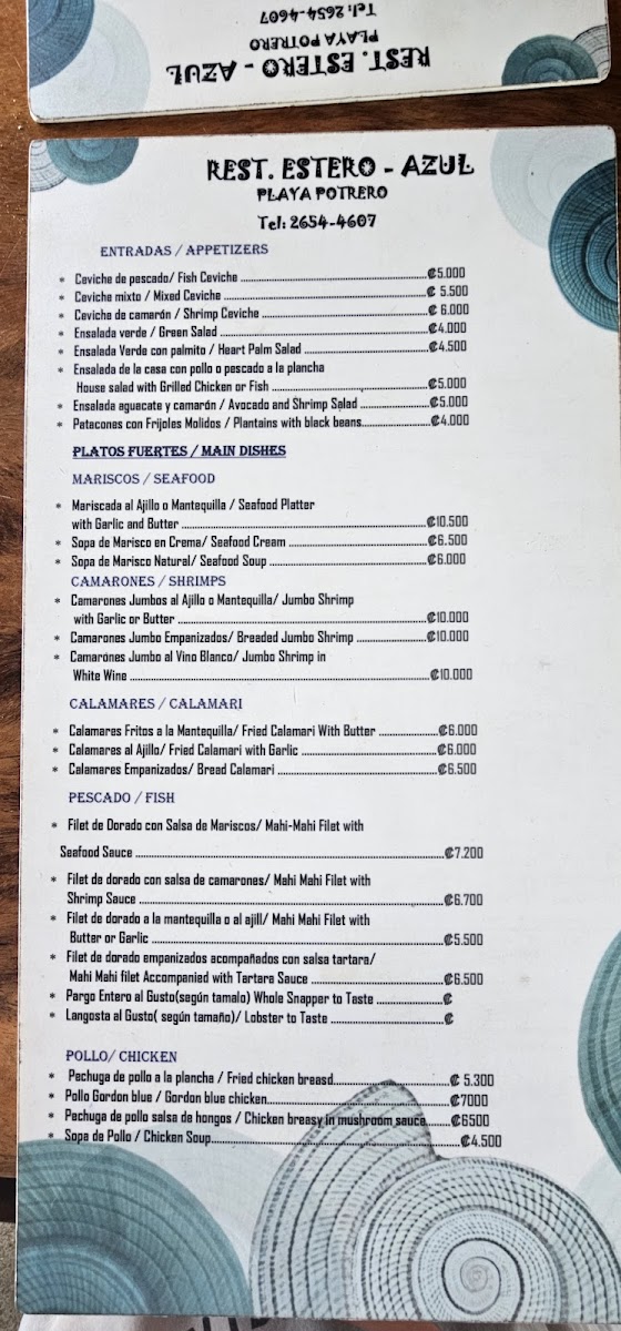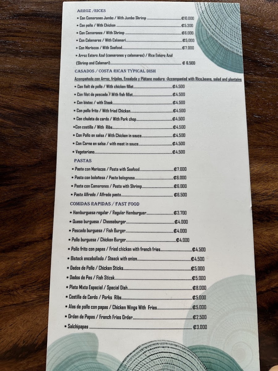 The menu at Estero Azul offers a straightforward, relaxed selection of classic Costa Rican dishes and fresh seafood, perfect for those looking to enjoy simple, authentic flavors in a beachfront setting. You’ll find a variety of hearty plates—like Arroz Con Pollo and Chicken Casado—alongside catch-of-the-day options such as the Seafood Platter or whole grilled snapper.