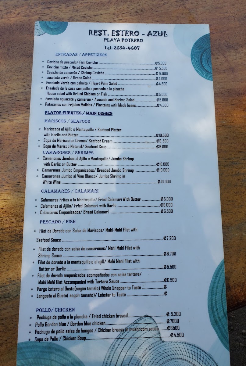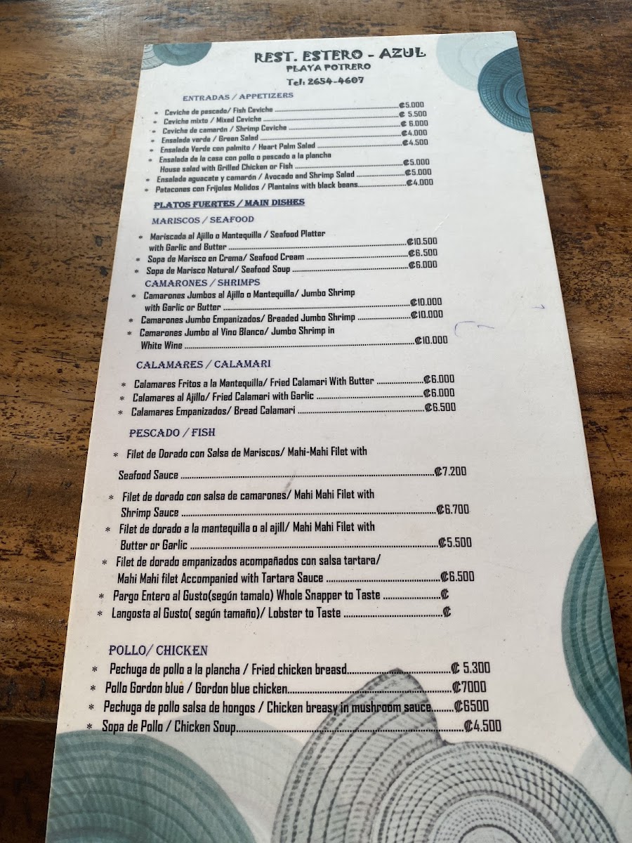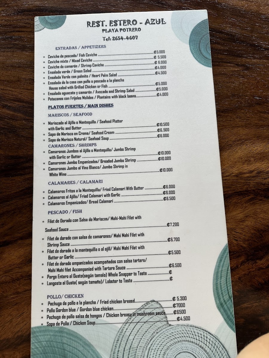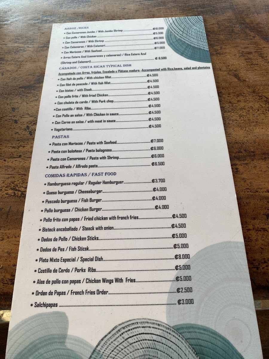 The menu at Estero Azul offers a straightforward, relaxed selection of classic Costa Rican dishes and fresh seafood, perfect for those looking to enjoy simple, authentic flavors in a beachfront setting. You’ll find a variety of hearty plates—like Arroz Con Pollo and Chicken Casado—alongside catch-of-the-day options such as the Seafood Platter or whole grilled snapper.